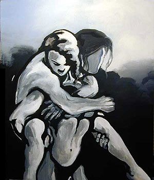 I painted this originally in college around 1990 but repainted it last year. The intent was to make questionable who exactly was shouldering whom.